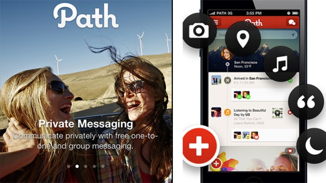PathPathis a way to privately message and share updates with your closest friends and family. According to its website, Path was inspired by Professor Robin Dunbar of Oxford University, whose research shows that people tend to have 5 best friends, 15 good friends, 50 close friends and family, and 150 total friends. As a result, users are only allowed to share updates – including photos, messages, locations, videos and more – with only 150 people.